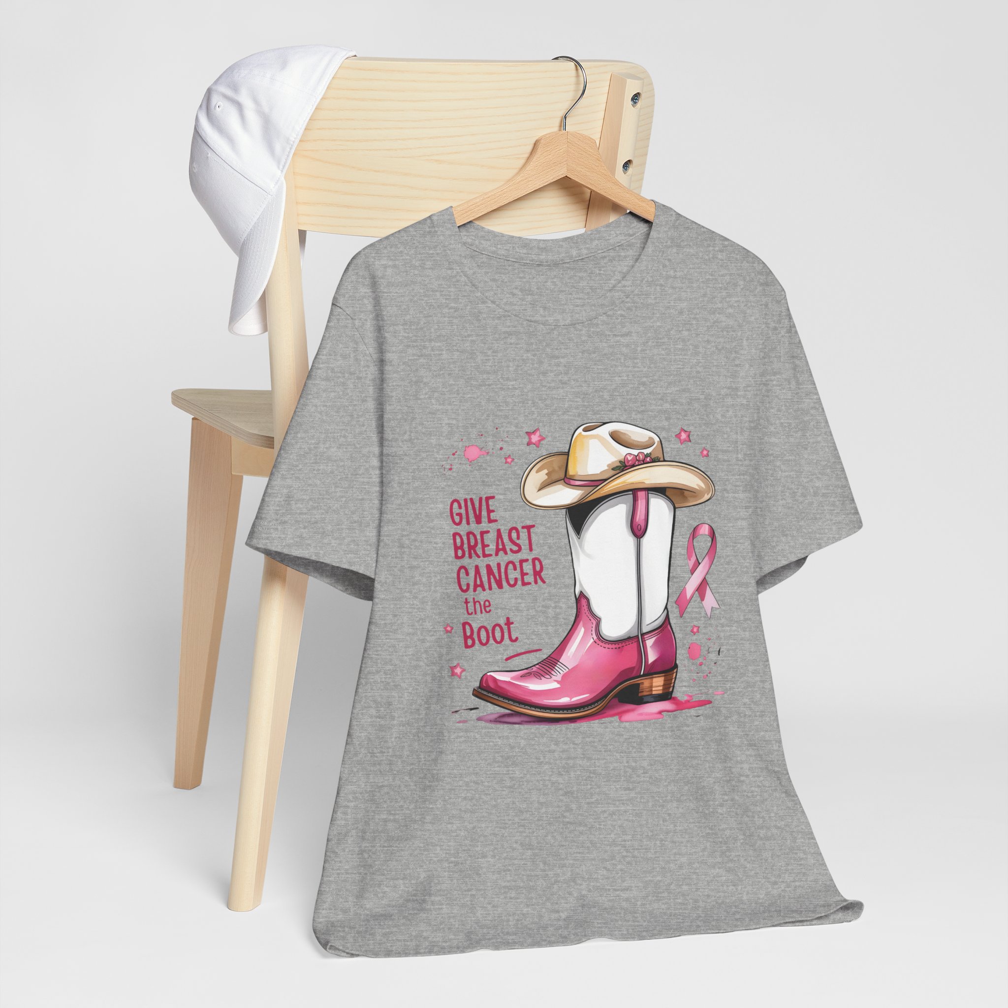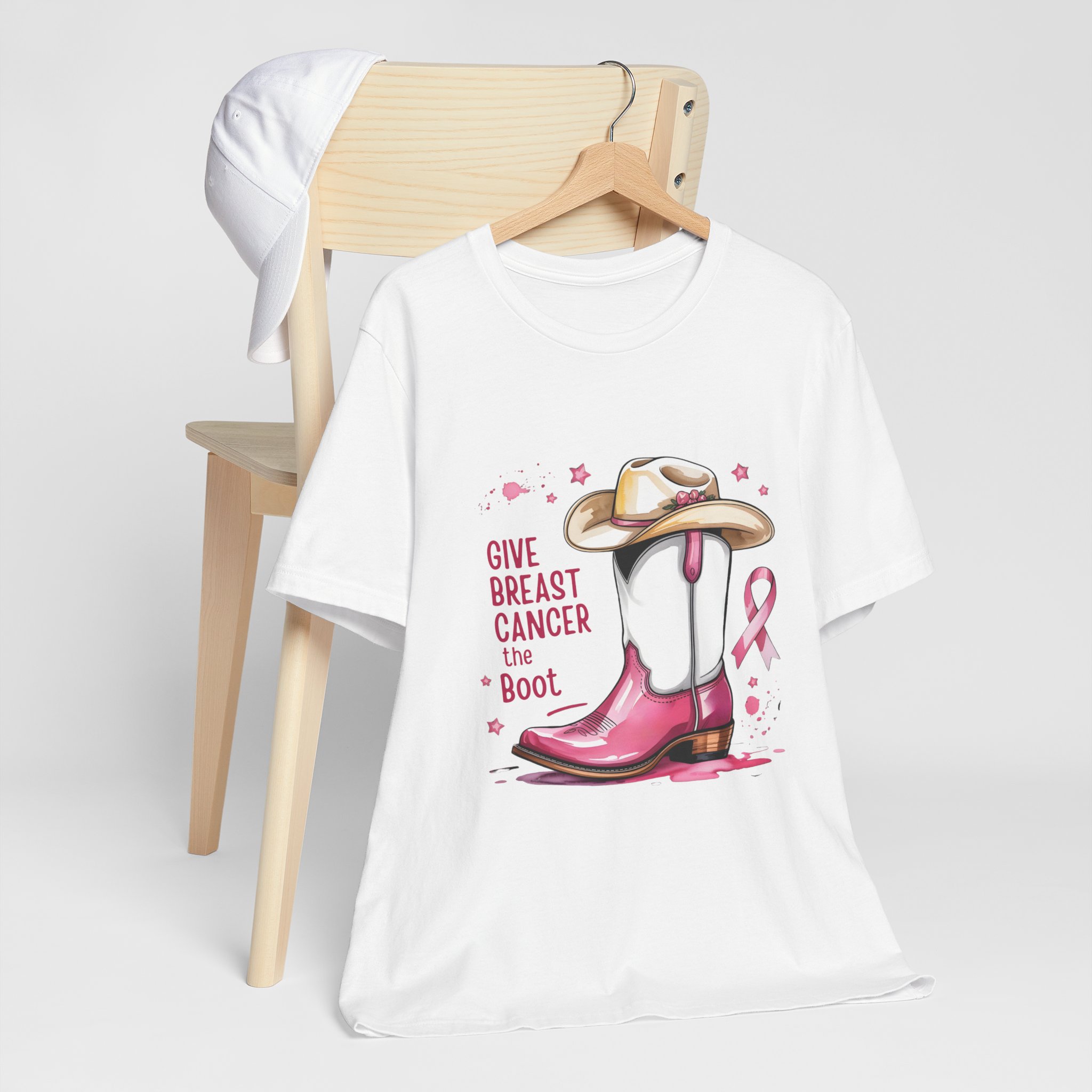 Step into strength and saddle up for a cause with our “Give Breast Cancer the Boot” western-inspired awareness tee. Featuring a bold pink cowgirl boot wrapped in blooming roses and topped with a stylish cowboy hat, and paired with the iconic pink ribbon — this t-shirt is a fierce reminder that breast cancer doesn’t stand a chance against hope, courage, and unity. Printed in vivid detail with a soft-touch feel, this t-shirt brings country charm and empowering energy to every outfit. Whether you’re showing support for a loved one or leading the fight yourself, this tee is a statement of resilience and solidarity with every step you take. Perfect for Breast Cancer Awareness Month, charity walks, rodeo season, or just repping your strength — country style.